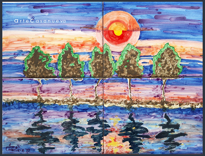«TIWI» (30cmx40cm) Cuadro compuesto de dos azulejos pintados a mano con un dibujo sencillo se utiliza la geometría elemental de las formas, donde atraen la disposición de los dibujos, los colores y la armonía en el espacio. Para decorar este diseño la mejor técnica para esmaltar es la cuerda seca...