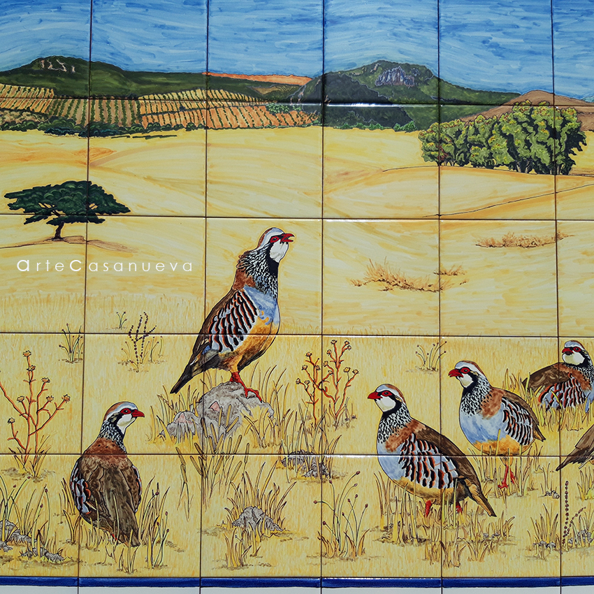 «Perdices en el campo sevillano», azulejos de 15cmx15cm. Detalle de parte de mural pintado a mano con la técnica de sobrecubierta o mayólica